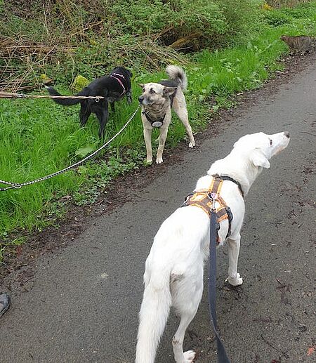 Sie lebt in der Pflegestelle in einem gemischten Rudel und ist auch grundsätzlich verträglich, ist aber oft gestresst durch die anderen Hunde - und umgekehrt.