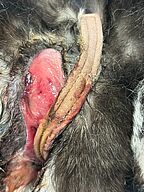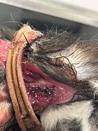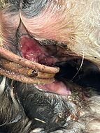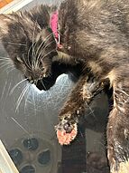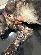 Wie man erkennen kann, hatte sie leider ein Halsband an, in dem sich ihr Bein verfangen hat. Man weiß nicht, wie lange sie schon in diesem grausamen Zustand ausharren musste. Vermutlich aber eine viel zu lange Zeit, denn das Halsband hatte sich bereits unter dem Beinchen tief eingeschnitten.