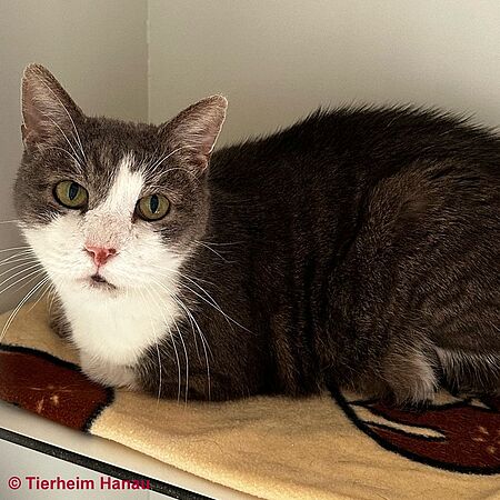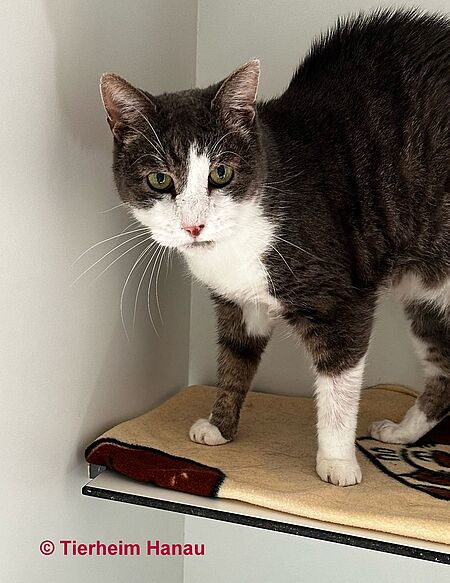 Motte ist eine ängstliche Katze, die sich, wenn sie es will, streicheln lässt, aber sonst lieber versteckt in einer Höhle sitzt. Leider hat sie Probleme mit der Hüfte und den Knien (HD; Patella Luxation). Sie bekommt regelmäßig Schmerzmittel. Evtl. muss eine OP durchgeführt werden.