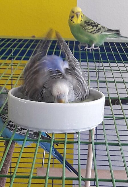 Zu meinem Erstaunen sitzen sie allerdings tagsüber die meiste Zeit im Schutzhaus. Da drin waren es letzte Woche bei der großen Hitze über 38 Grad!!! Offensichtlich Australien-Feeling :-) Die Ausflugzeiten in die Voliere sind hauptsächlich morgens und gegen Abend, wenn die Sonne anfängt unterzugehen. Dann fliegen sie alle wie wild kreuz und quer und mir geht das Herz auf, wenn ich das beobachte. Die beiden Vogelbäder werden ignoriert. Ebenso uninteressant finden sie das „Grünzeug“, meinen riesigen Johannisbeerstrauch der in der Voliere steht. Der Busch wird gar nicht angeflogen. Ich dachte die Piepsis würden den als Versteck toll finden und hatte auch die Befürchtung, dass sie Blätter oder Früchte fressen und dann brütig würden.
