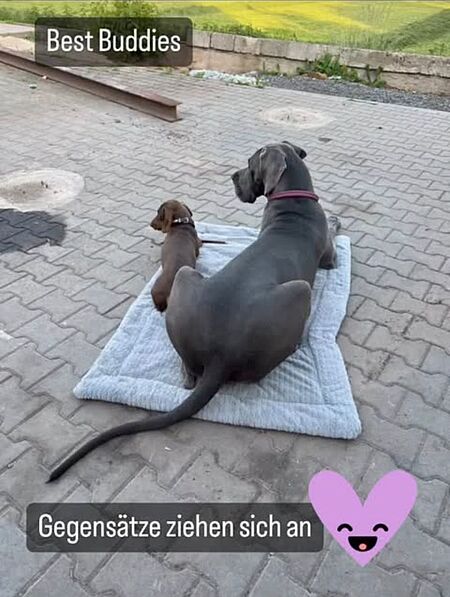 Eigentlich muss man dazu sagen: Bones ist keine Deutsche Dogge – er ist ein Chihuahua, der zufällig im Körper einer Deutschen Dogge gelandet ist. Er hat nämlich absolut keine Ahnung, wie groß oder schwer er eigentlich ist. Das äußert sich in einer herrlich charmanten Mischung aus stürmischer Freundlichkeit, Tollpatschigkeit und Doggen-typischer Begeisterung für Menschen.