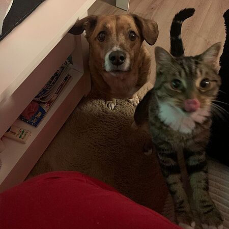 Bones hat viele Jahre problemlos mit drei Katzen zusammengelebt. Er fand sie unglaublich spannend und hätte am liebsten ständig seine Nase in ihr Fell gesteckt – was sie leider nicht ganz so begeistert gesehen haben. Böse oder aggressiv war er dabei aber nie. Auch mit Pferden kommt er gut klar und ist jahrelang bei Ausritten nebenher gelaufen. Berührungsängste kennt er nicht – was allerdings auch bedeutet, dass man manchmal ein bisschen aufpassen muss, weil er schlicht nicht versteht, dass Pferde theoretisch treten könnten.