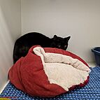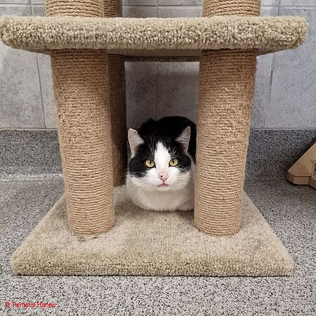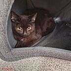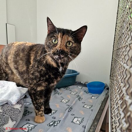 Motte ist eine ängstliche Katze, die sich, wenn sie es will, streicheln lässt, aber sonst lieber versteckt in einer Höhle sitzt. Leider hat sie Probleme mit der Hüfte und den Knien (HD; Patella Luxation). Sie bekommt regelmäßig Schmerzmittel. Evtl. muss eine OP durchgeführt werden.