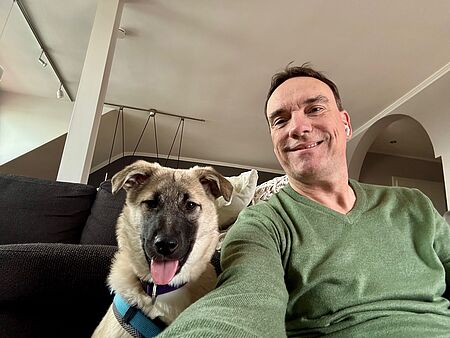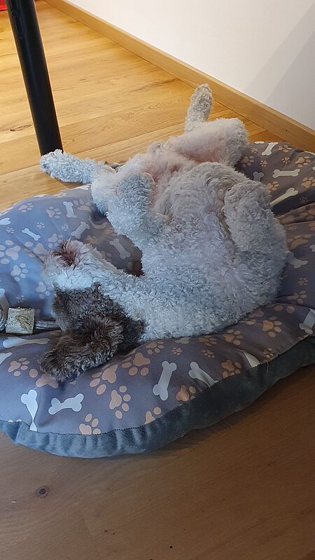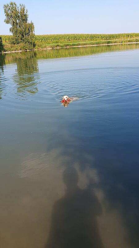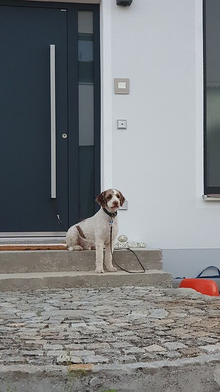 Er hat sich sehr gut eingelebt, dreimal die Woche geht er mit ins Büro. Dort schläft er die meiste Zeit, wenn er nicht schläft holt er sich Streicheleinheiten ab. In der Hundeschule haben wir auch Erfolge und sind aus der Anfängergruppe in die nächste Gruppe gekommen. Wir aportieren sehr viel mit ihm, das macht ihm richtig Spaß.