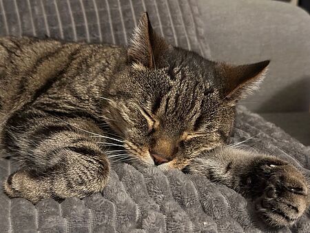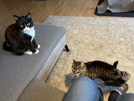 Körperpflege ist für beide kein Thema, sie lieben das Bürsten und jeder auf seine Art auch das Kuscheln. Ari wirft sich auf den Rücken, winkelt die Beine an und spricht mit den Augen: Streichel mich! Niko klettert halb auf das Sofa und kriecht förmlich in einen hinein. So ganz geheuer ist ihm das mit dem Sofa noch nicht.